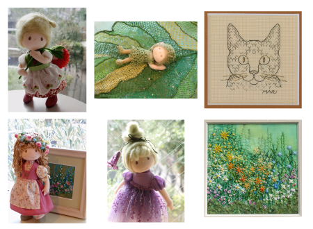 | 新刊本『米山マリの手作りの人形』(主婦の友社)、 『Mariのドール・メイキング』の中の人形たちのほか、 人形×刺繍の小さな作品や、ネコの刺繍額などを 展示いたします。 作品展の会場写真 |