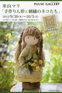 | ★作品展のご案内★ 米山マリ 「手作り人形&刺繍のネコたち」 会期 2015年9月30日(水)〜10月5日(月) 11:00〜19:00(最終日は16:00まで) 会場 神楽坂パルスギャラリー |